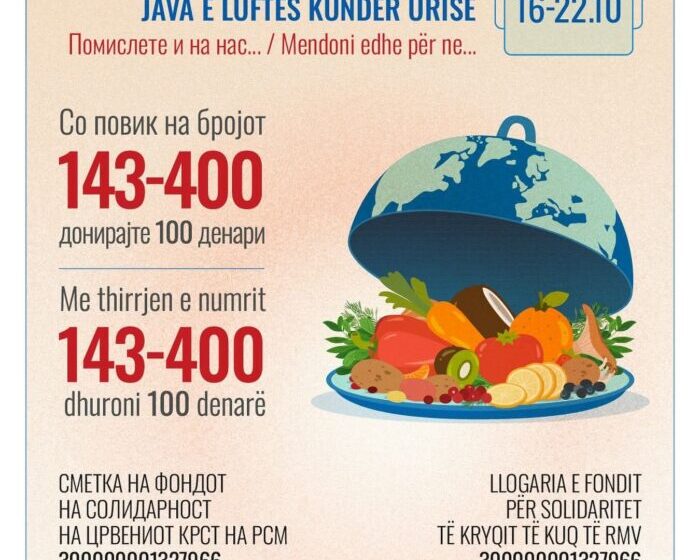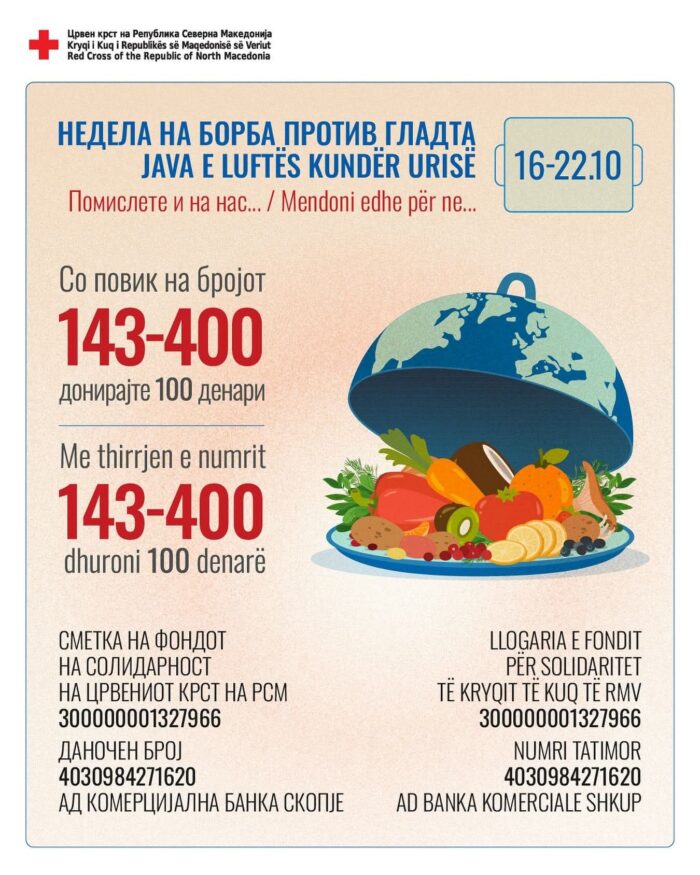 Црвениот крст на Република Северна Македонија и оваа година се вклучува во глобалните акции за борбата против гладта со организирање на кампања „Помислете и на нас“ во рамки на „Неделата на борба против гладта“, која ќе се спроведе од 16 до 22 октомври преку општинските организации на Црвениот крст и Црвениот крст на град Скопје.